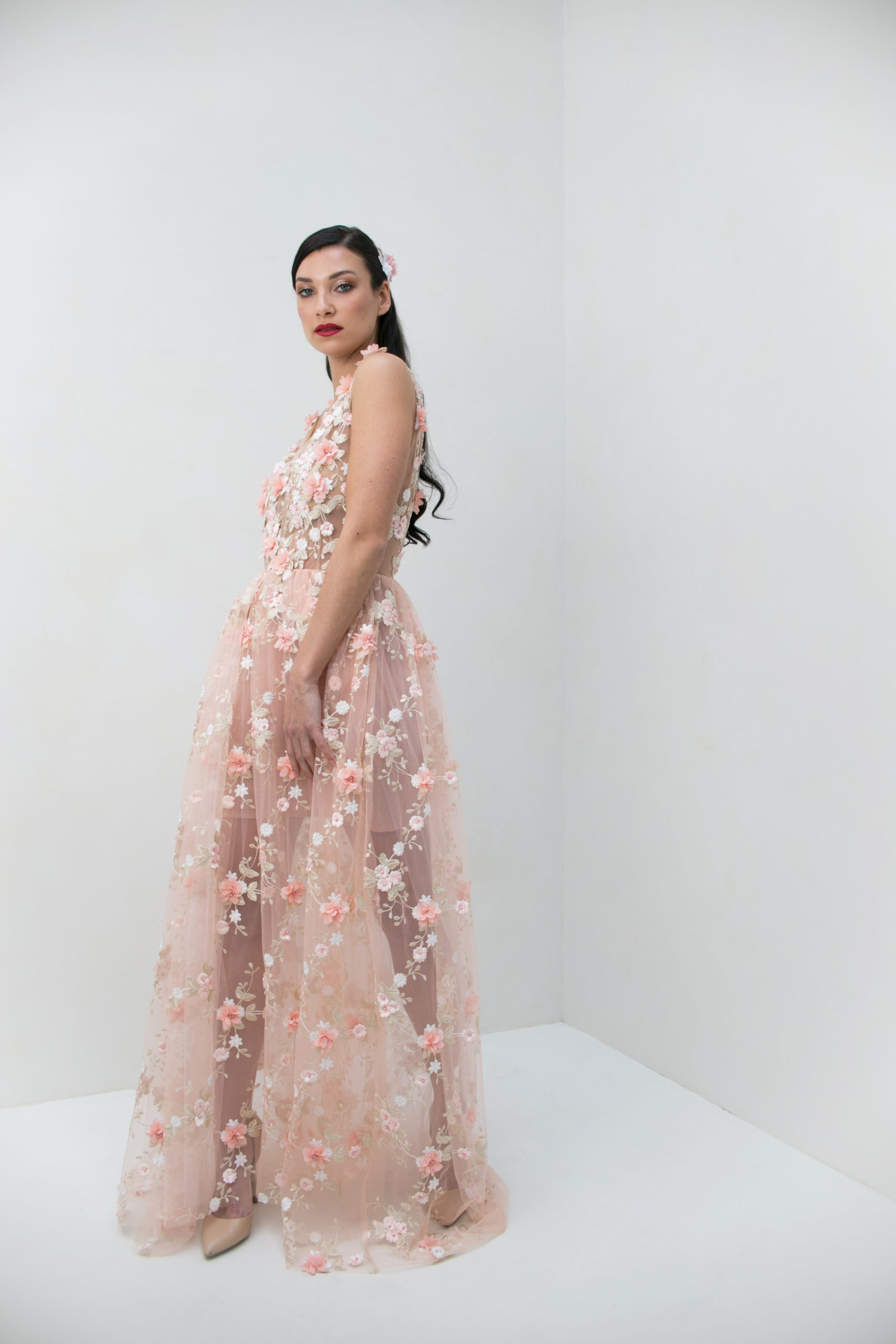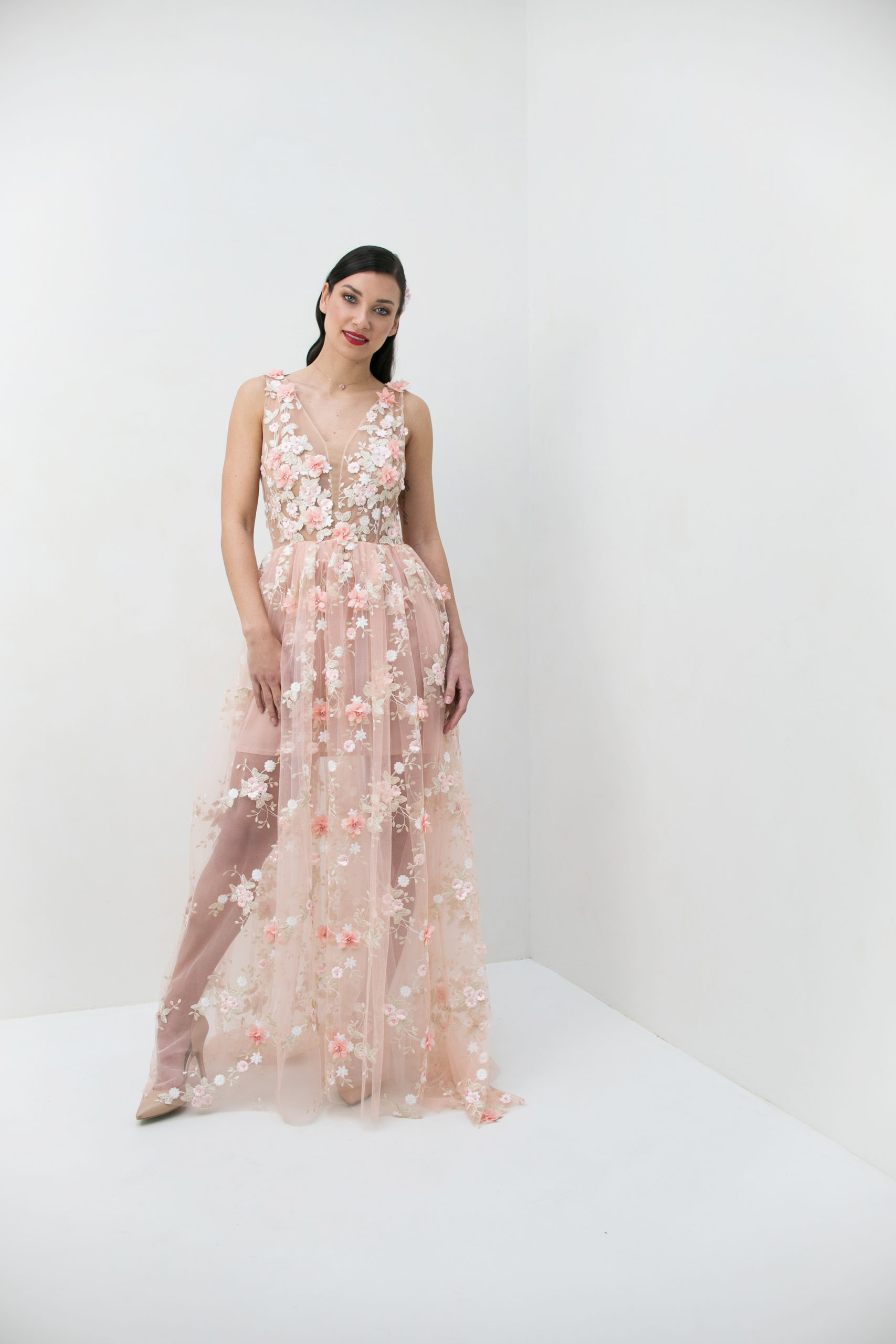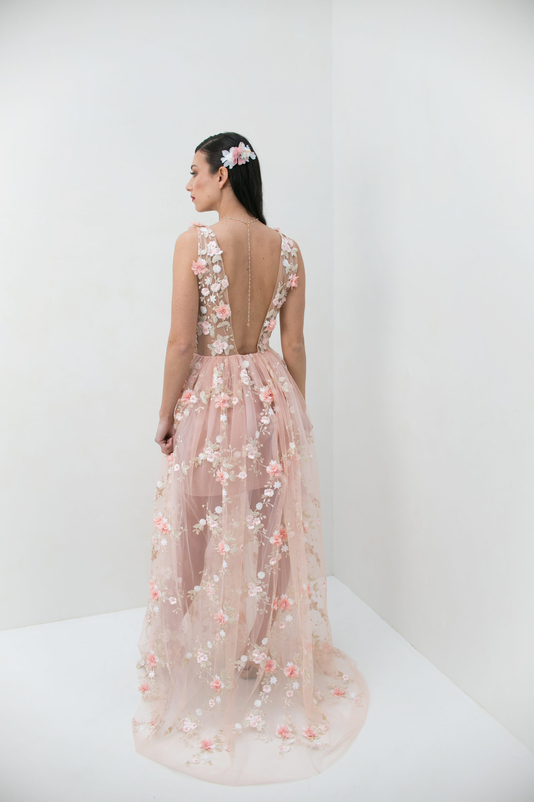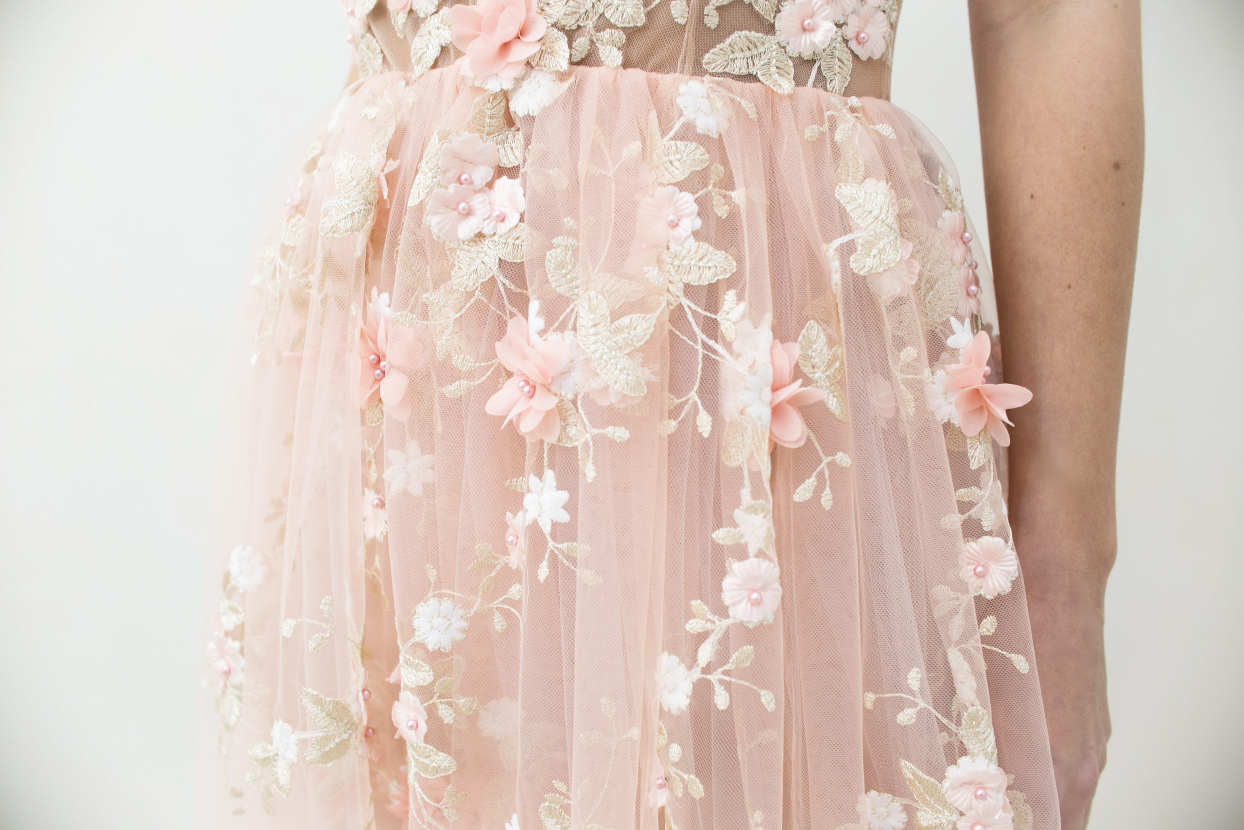 Robe de mariée entièrement brodé de fleurs dans des tons rose poudré, blanc et doré