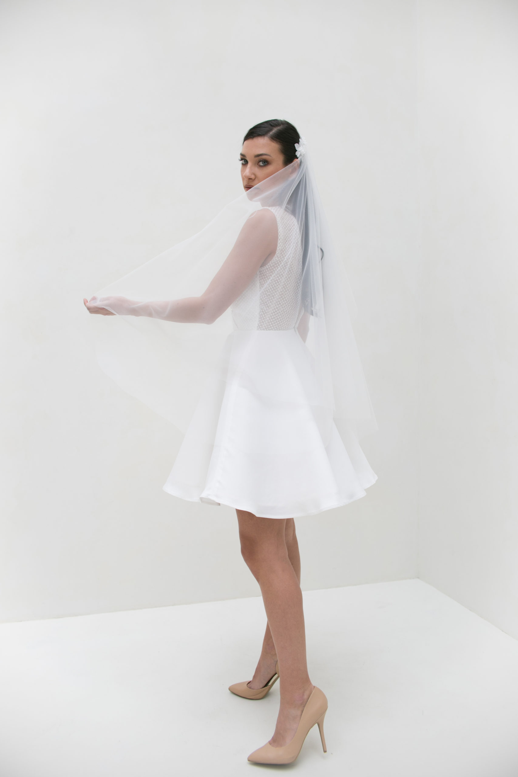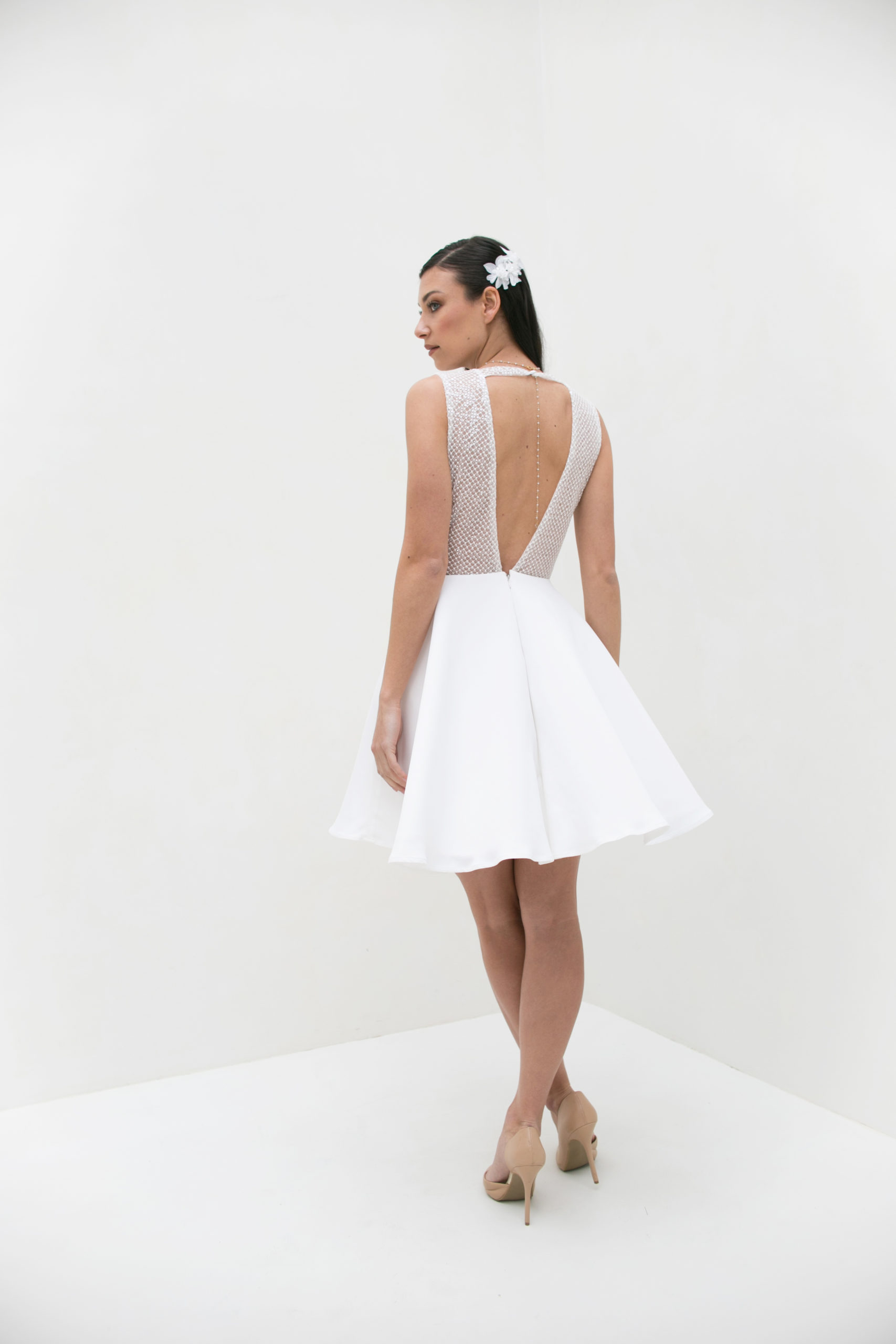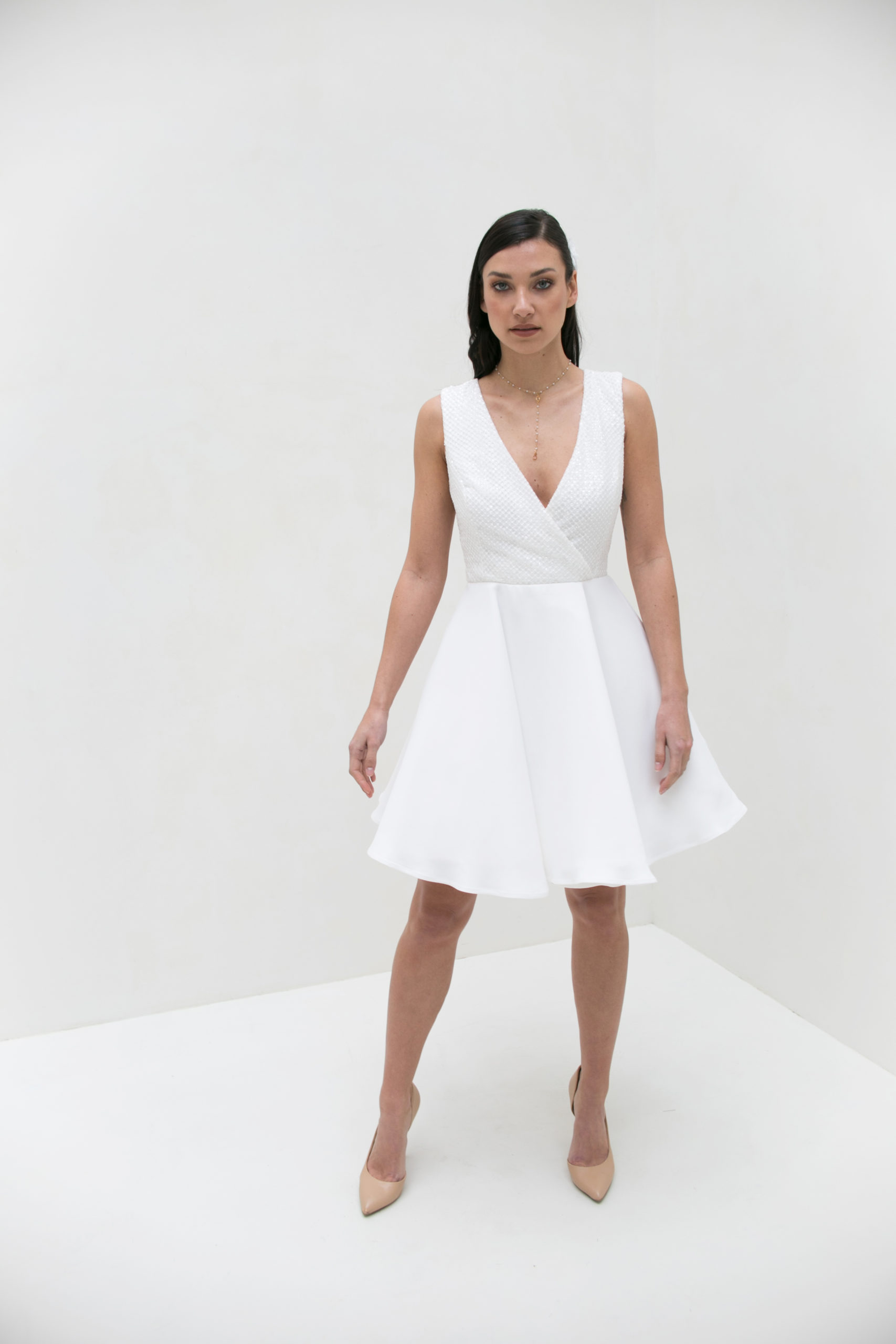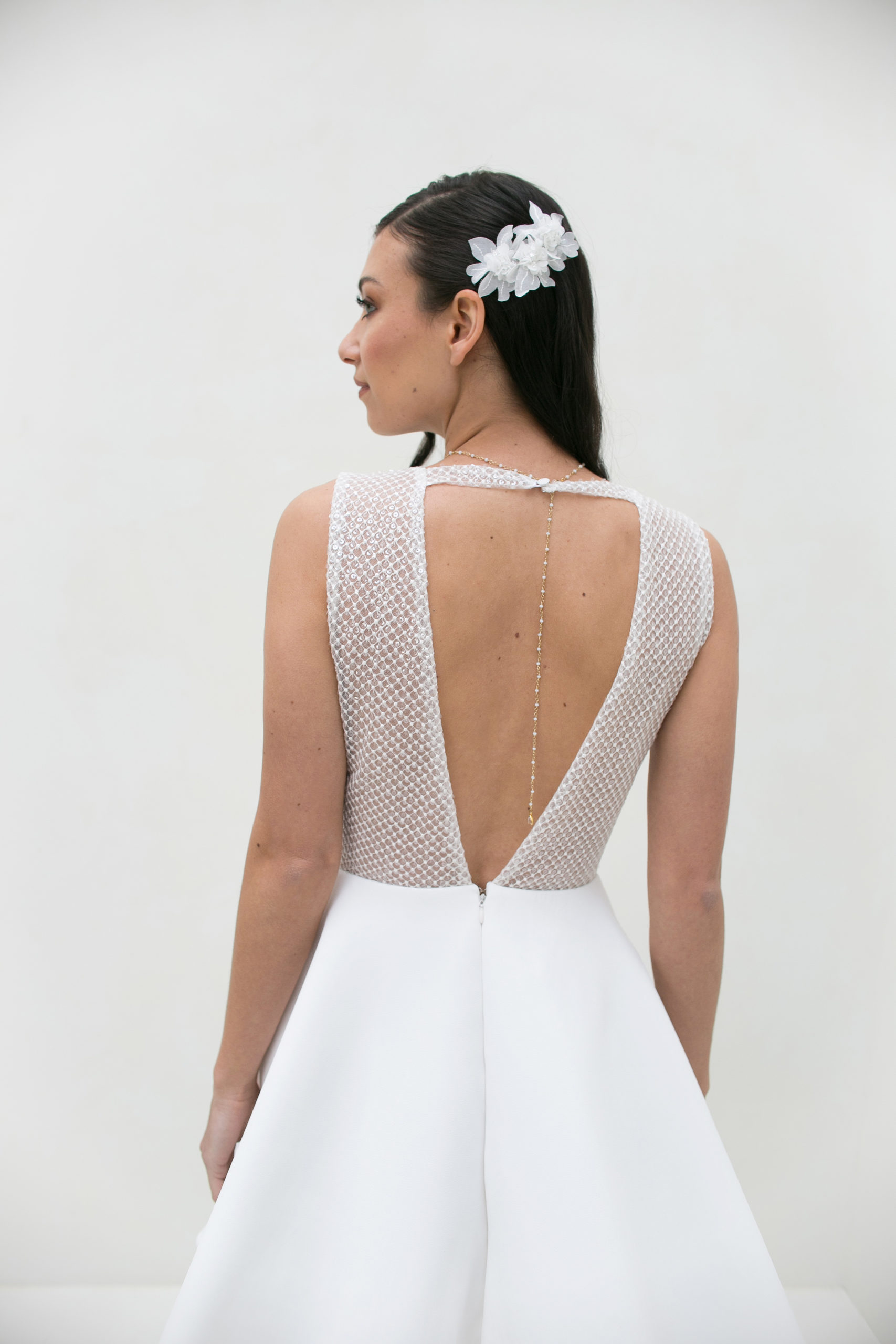 Robe de mariée courte en crèpe et tulle brodé de sequins
