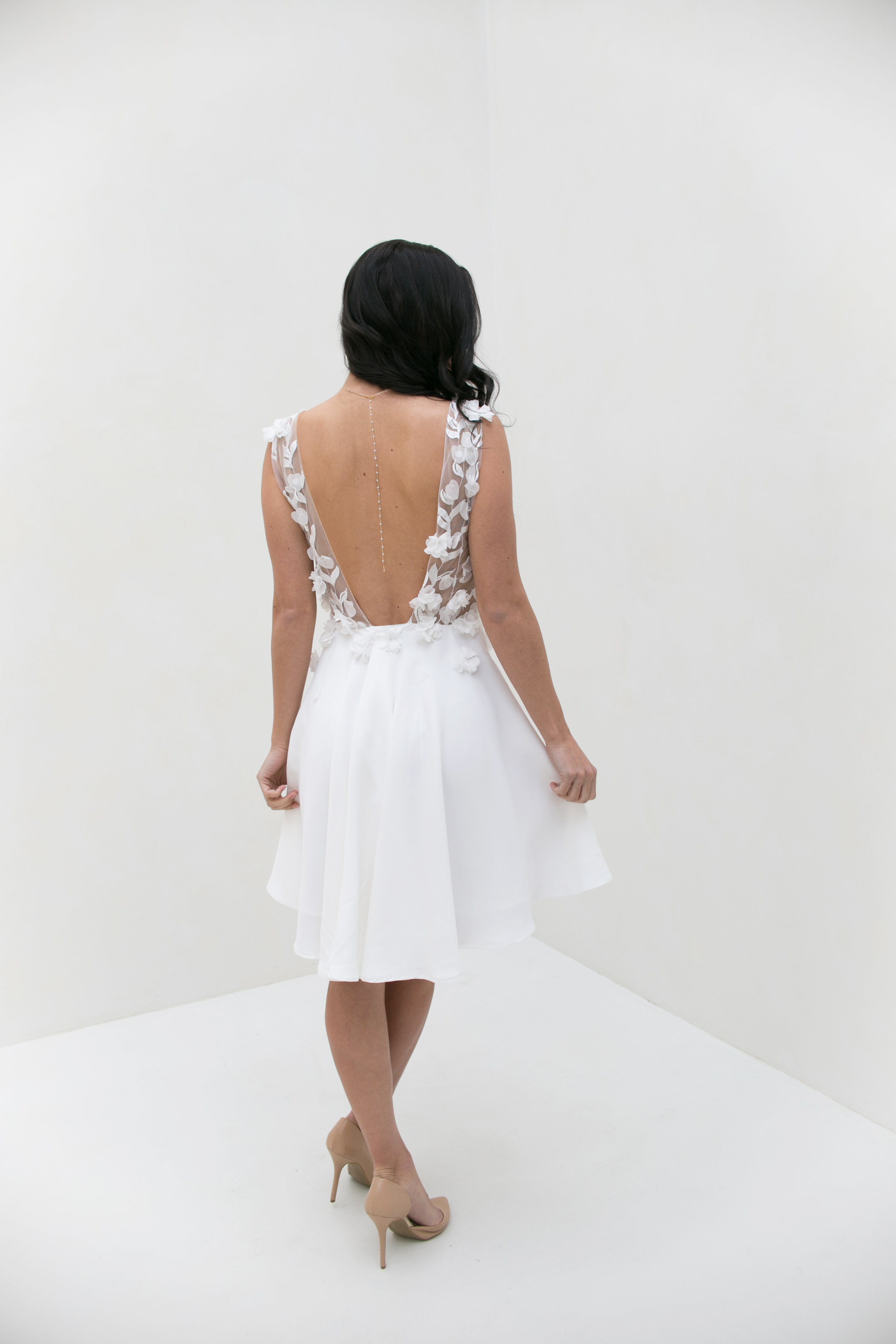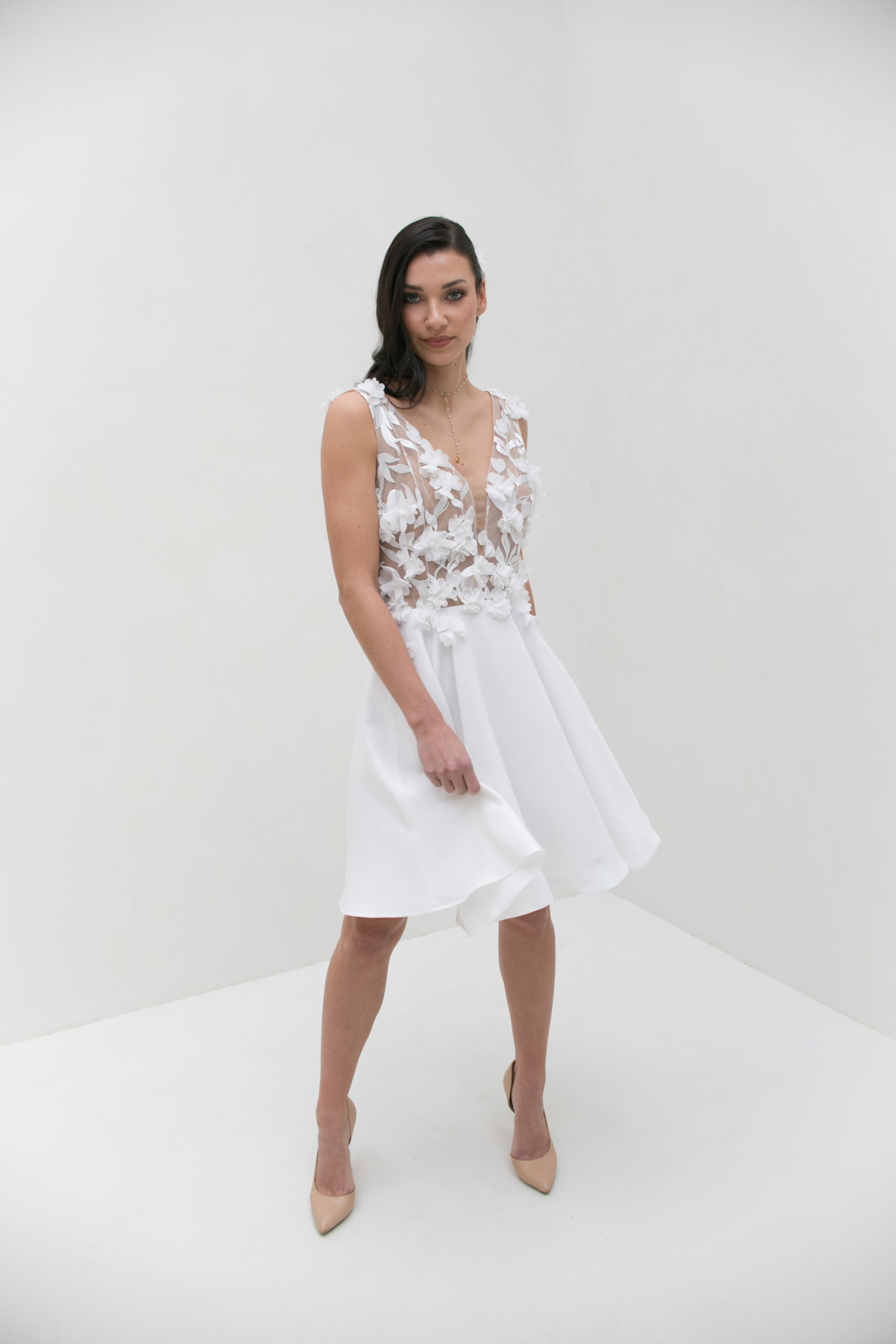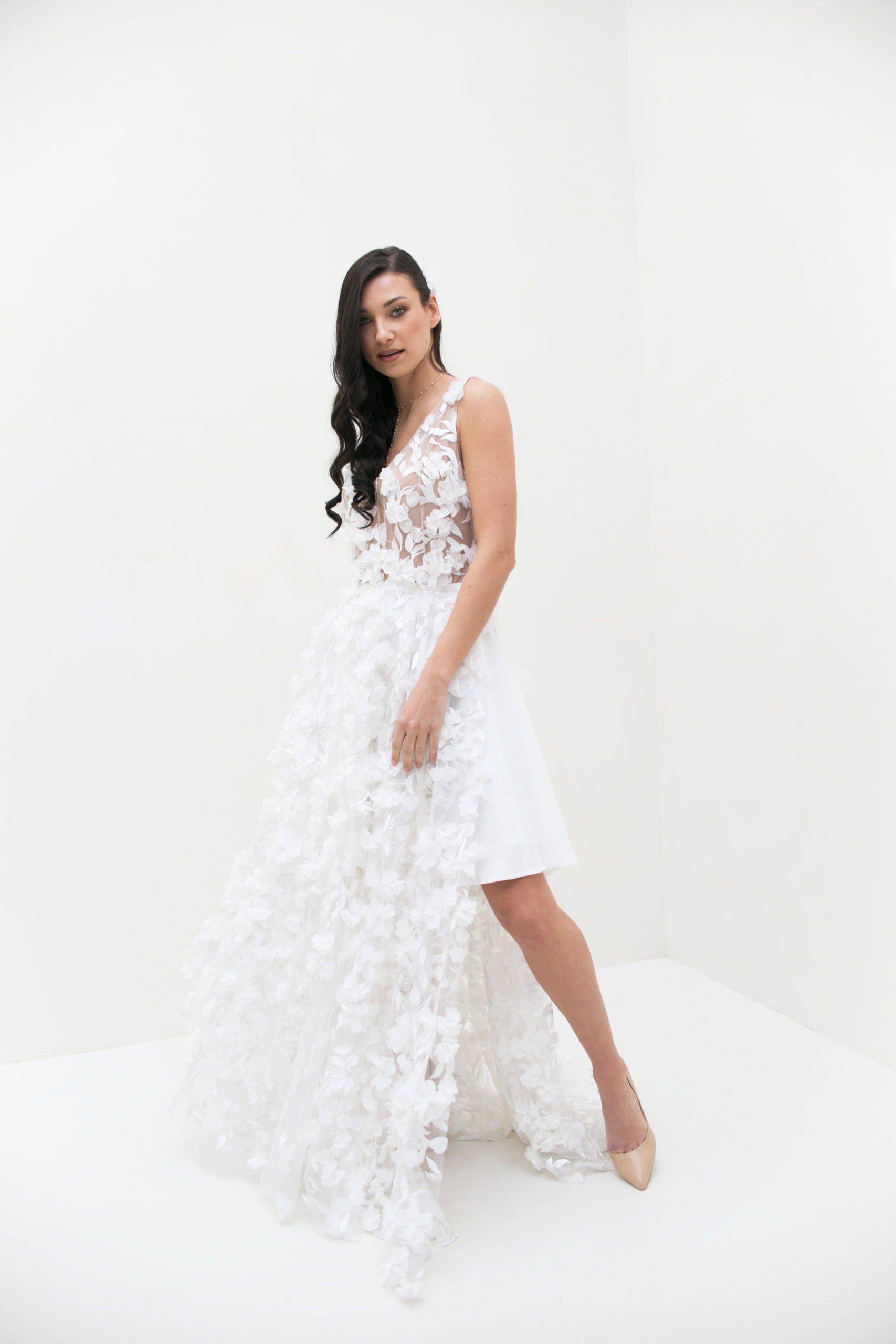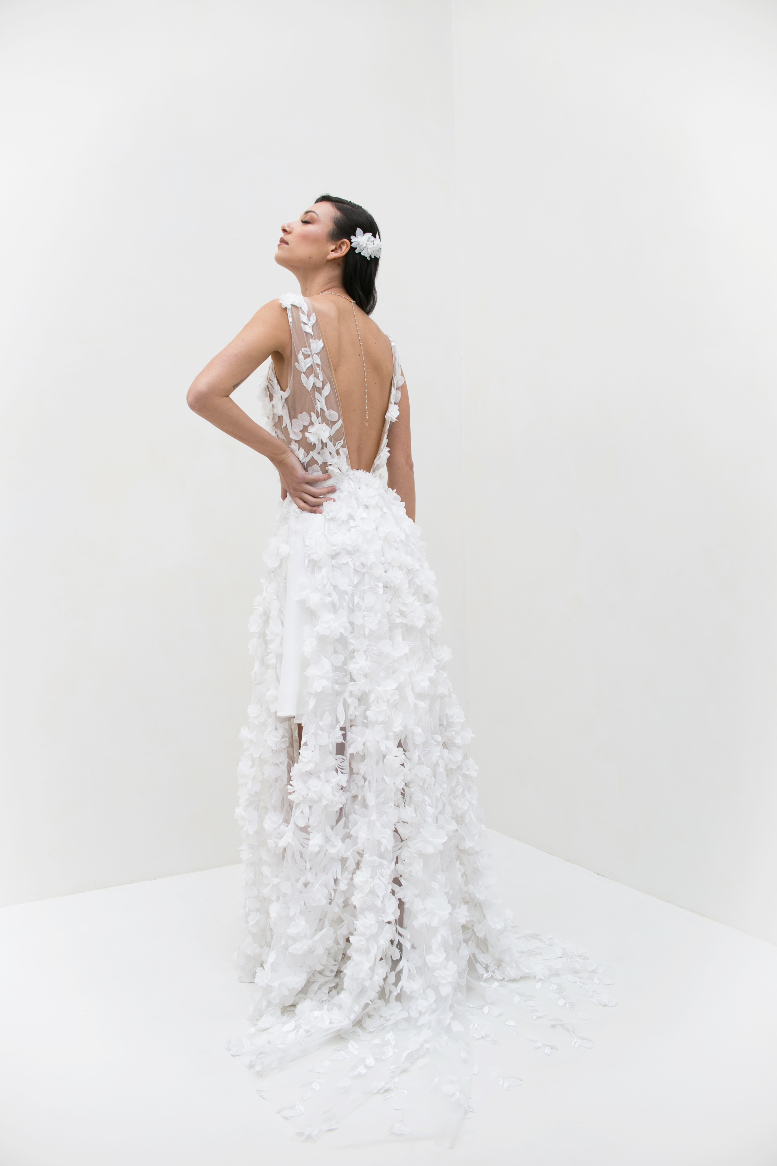 Robe de mariée Robe de mariée modulable Lana Robe de mariée civile en crèpe fluide et tulle brodé de fleurs Décolleté plongeant devant et dos Jupe à godets parfaite pour danser ! Collection mariageCollection PromesseRobe de mariée brodée sofiaCollection PromesseRobe de mariée colorée kate